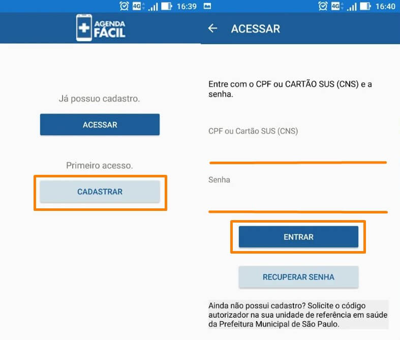 Após baixar o aplicativo no Apple Store ou Google Play, o usuário deve retirar o Código Autorizador na UBS mais próxima de seu trabalho ou casa para poder se cadastrar e fazer o primeiro acesso. Utilize o Sistema de Localização de Estabelecimentos de Saúde da Rede SUS do Município de São Paulo, para pesquisar a UBS mais próxima utilize o Busca Saúde.